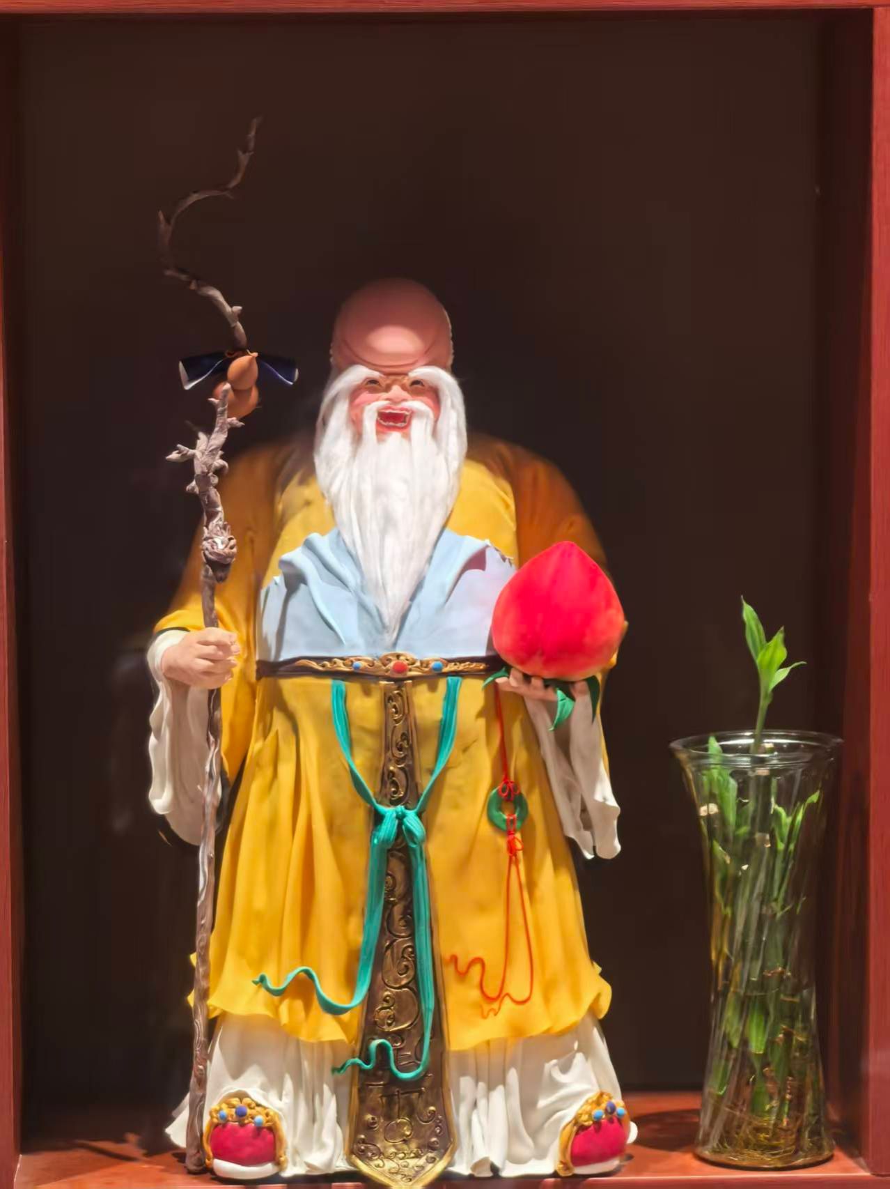上午10时许,师生们在街区的“非遗工坊”见到了鄠邑面塑代表性传承人蔡锐军大师。蔡大师面前的木桌上整齐摆放着各色面团、塑刀与定型工具,桌面上还陈列着《八仙上寿》《百子图》等经典面塑作品,细腻的衣纹、灵动的神态让学生们纷纷驻足惊叹。“面团里藏着千年文脉,捏塑中见得工匠精神。”蔡大师拿起一块温润的白面团,开篇便将面塑技艺与文化传承的关系娓娓道来。他指着桌上的“献饭”面塑解释:“鄠邑面塑最早可追溯到唐代,过去每逢婚丧嫁娶、节庆祭祀,家家户户都会做‘献饭’面塑,比如过年的‘枣花馍’、祝寿的‘寿桃’,既是礼仪载体,也是老百姓的情感表达。”