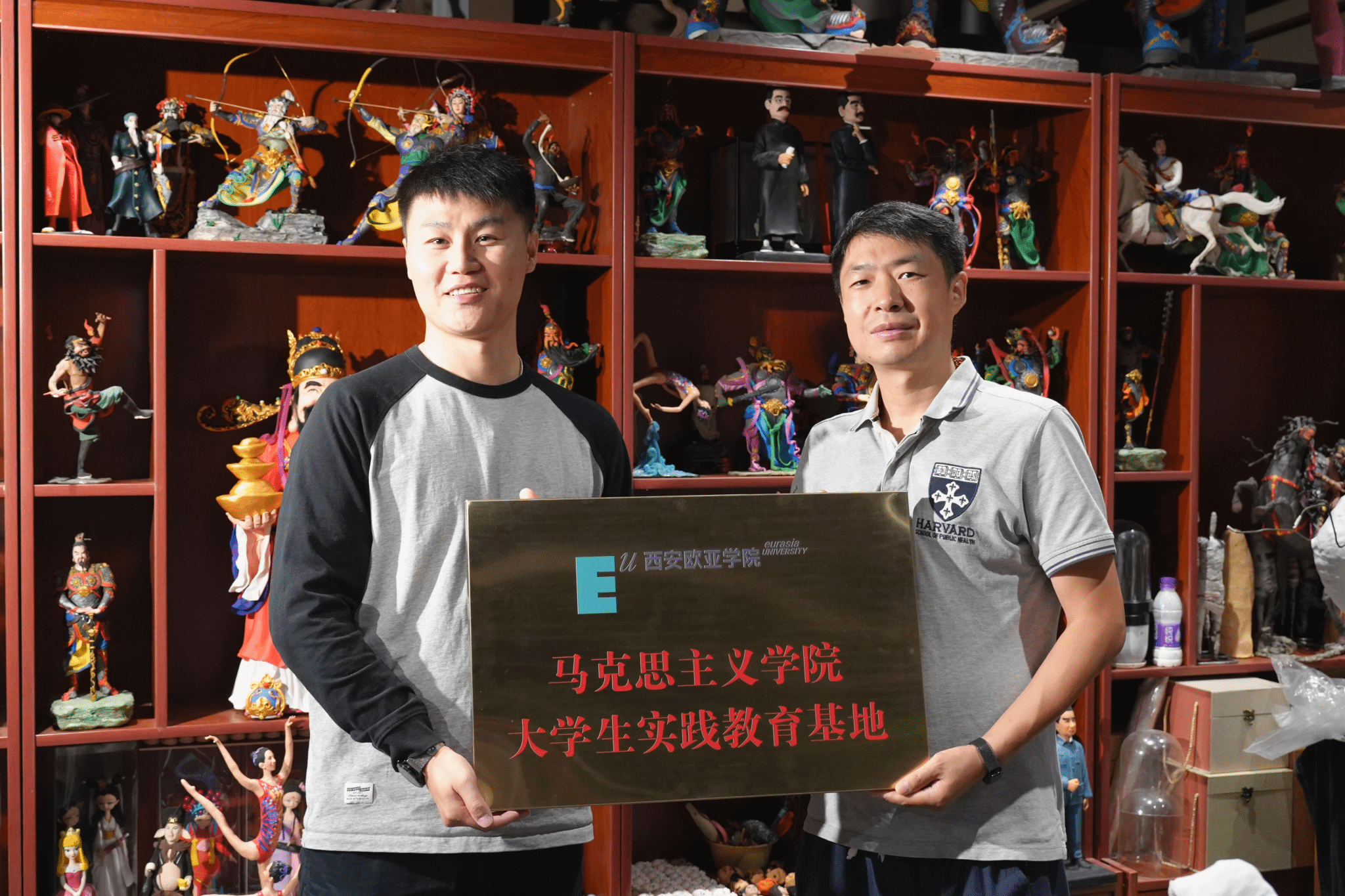 活动的重要环节——西安欧亚学院马克思主义学院大学生实践基地授牌与聘书颁发,在午后举行。马克思主义学院李泽丰老师将铜牌郑重地交到蔡锐军大师手中,铜牌上 “西安欧亚学院马克思主义学院大学生实践基地” 的字样在灯光下格外醒目。同时,马芳琴老师还为蔡大师颁发了实践导师聘书,李泽丰老师指出:“此次实践基地的建立,是我们探索‘思政小课堂’与‘社会大课堂’深度融合的新起点。未来,我们将以基地为平台,打造‘理论研修+技艺实践’的育人模式——不仅会组织学生定期来这里跟随蔡大师学习面塑技艺,还会结合马克思主义基本原理课程,开展‘非遗中的哲学’‘传承里的担当’等主题研讨,让学生在动手实践中深化对理论的理解,在文化传承中坚定理想信念。”
