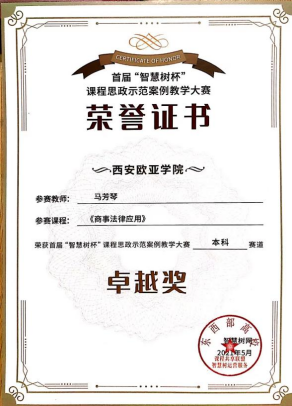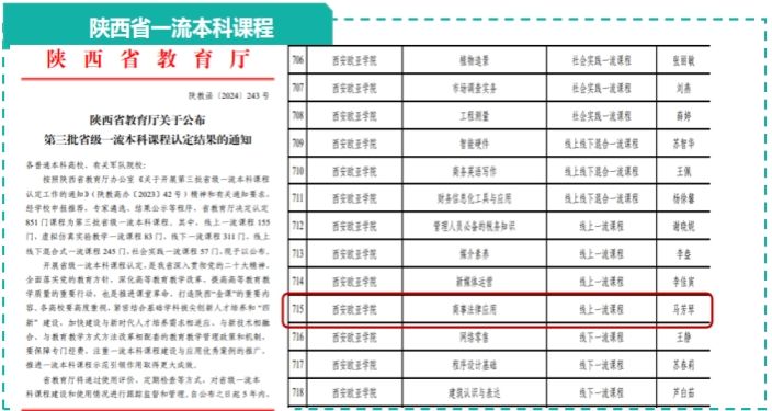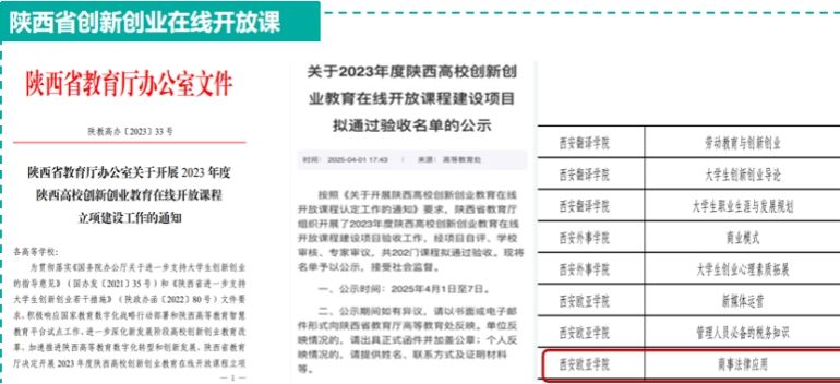 经过该课程团队在教学设计、思政融合与资源建设等方面多年坚持不懈的探索与实践,《商事法律应用》课程于2024年获评“陕西省一流课程”、2025年获评“陕西省课程思政精品课”并顺利通过了“陕西省创新创业在线开放课”的验收。
