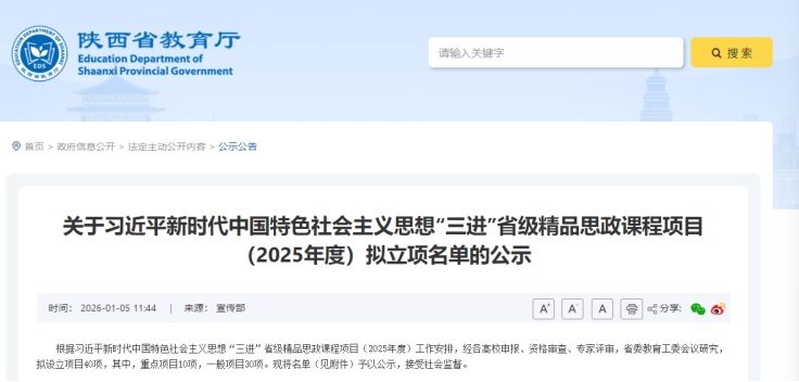 2026年1月5日,陕西省教育厅公布了2025年度习近平新时代中国特色社会主义思想"三进"省级精品思政课程拟立项名单。全省拟设立项目40项,其中包括重点项目10项、一般项目30项。在全省本科高校的激烈竞争中,民办高校仅有3个项目成功立项,我院《毛泽东思想和中国特色社会主义理论体系概论》课程组凭借创新的教学改革成果脱颖而出,成功进入立项公示环节。